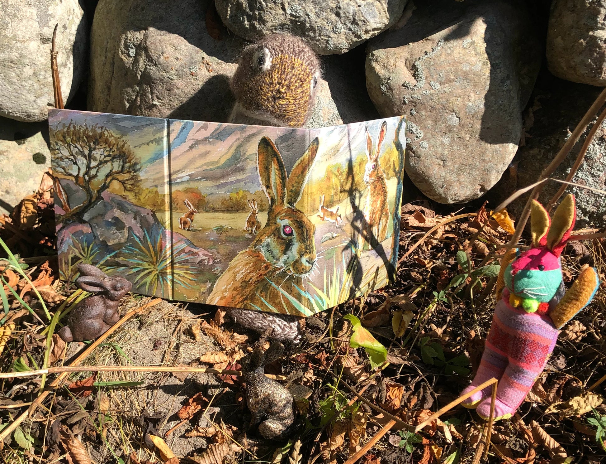Tri-fold DM screen with art depicting rabbits in the sunset foothills and quick rules reference inside for the dungeon master.