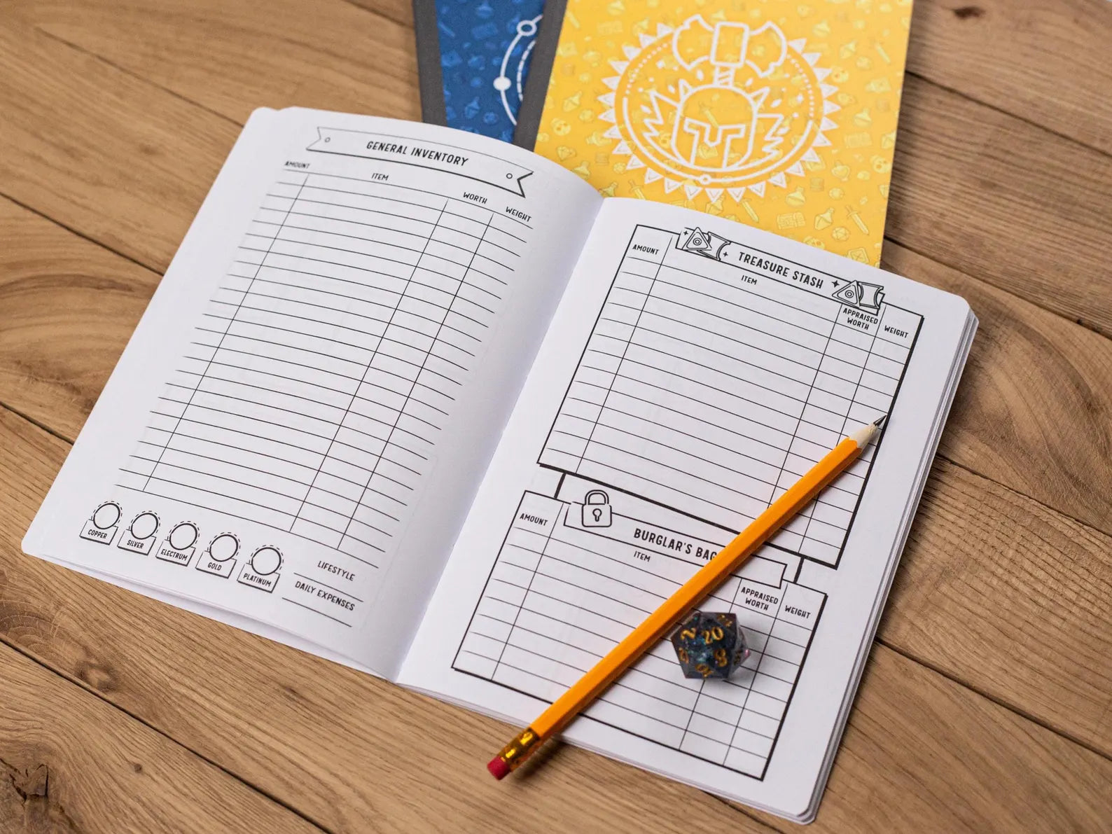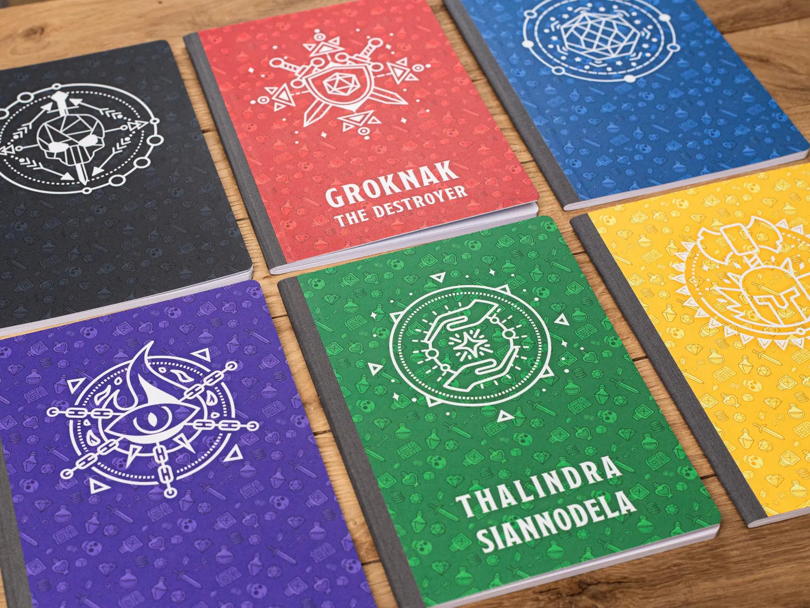 The all-in-one character journal for D&D 5e: a hand-sewn A5 booklet that opens flat, loves pencil, and is built for real table play. Pick your favourite class and colour combination, or take customization even further with your character's name on the cover!