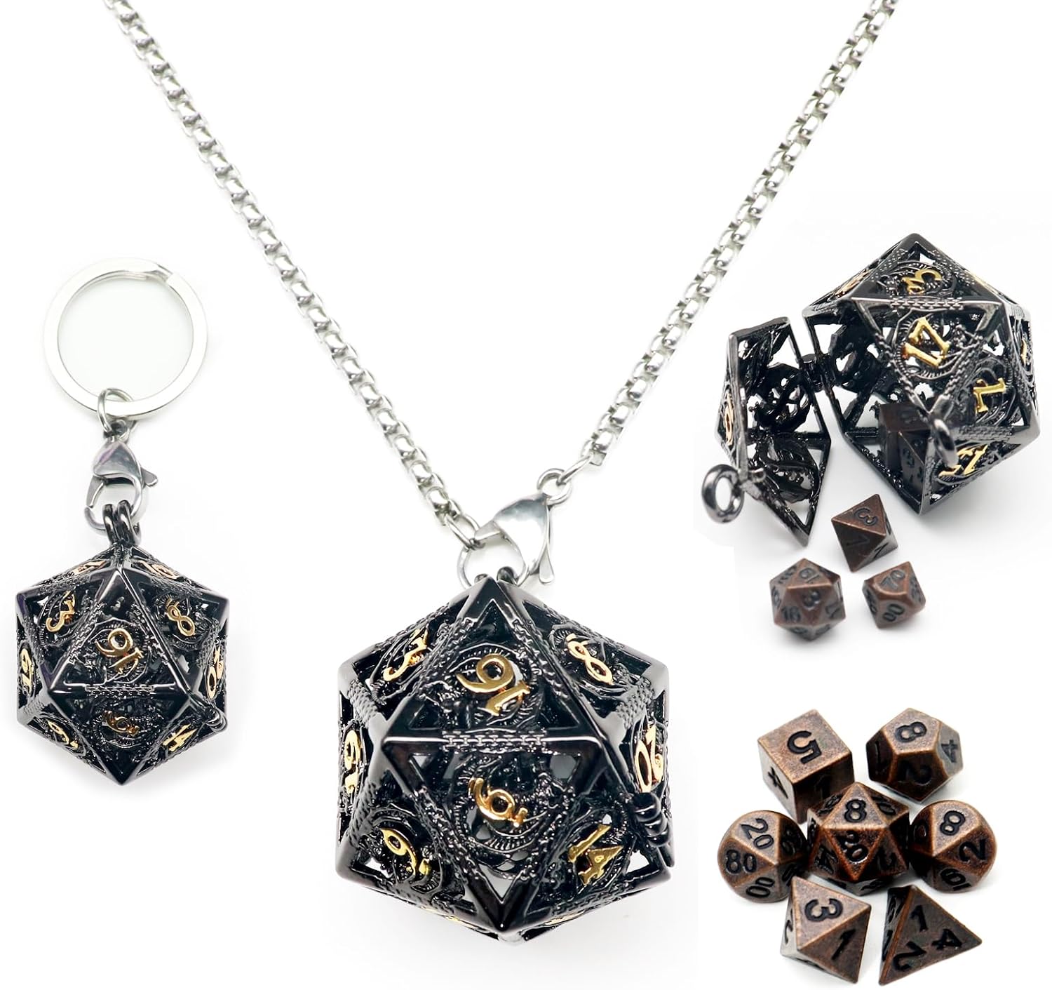 Hefty Metal Dice Set: The dice are made with solid zinc alloy for use of years. Hollow cage is made of brass. Necklace and keychain are made with 304 stainless steel.